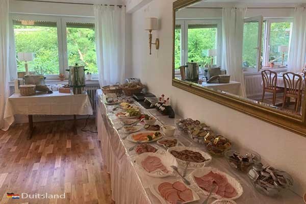 Na een goede nacht start de dag met een uitgebreid ontbijt in de ontbijtruimte. In de gaststube wordt een ‘goedburgerlijke Duitse keuken’ aangeboden, met wijnen uit eigen aanbouw. In de warmere periode is het extra prettig buiten zitten op het terras of in de tuin. De ligging direct aan het water maakt het eenvoudig om na een fietstocht of wandeling nog even te blijven hangen met een drankje, terwijl het in de avond weer rustig wordt.